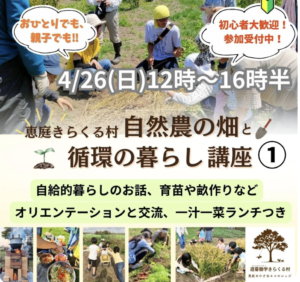 土と暮らしの寺子屋・第1回目のご案内 いよいよ4/26(日)から、今年のメインプログラム「土と暮らしの寺子屋」が始動します! 大人も子どもも、みんな混ぜこぜになって「循環の暮らし」と「自然農の畑づくり」を学び、体験する全8回のきらくる村の寺子屋🎉😊 […]